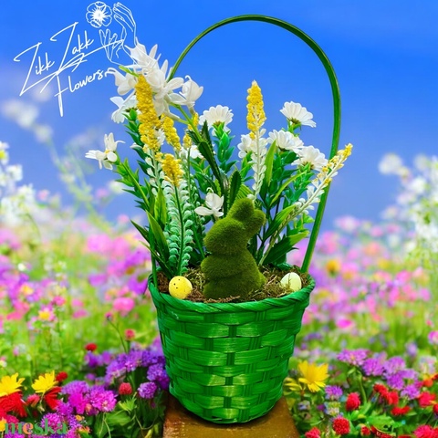 - Anyaga: fonott kosár, moha nyuszi, örök virágok