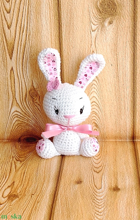 Fehér Nyuszi lány - szívecskés - púder szalagos- horgolt marokállat