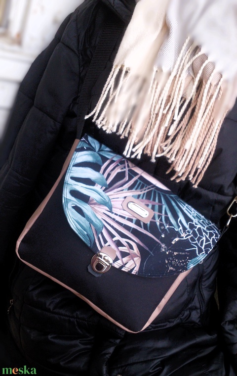 Cross body - pálmás bézs -fekete/ oldaltáska, testtáska - bőr kiegészítőkkel - ajándék - Heva táska - karácsony
