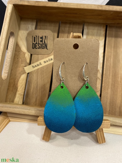 Szaturáció - színátmenetes, zöld és kék, festett fa fülbevaló, csepp alakú, nagy