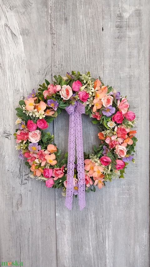 - Anyaga: művirágok, műzöldek, vesszőalap, selyemvirágok, szalag