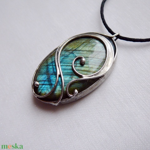 A medál Tiffany technikával készült labradorit és ólommentes, ezüsttartalmú ón felhasználásával. A díszítés szintén saját készítésű, nem tartalmaz gyári elemeket. A fémrészt óezüstre patináztam, lekezeltem antioxidánsal és lelakkoztam, hogy sokáig szép maradjon.
