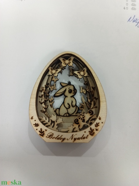 Rétegelt lemezből lézer vágott és gravirozott tojás. Méretei: 65mm magas, 55mm széles és 14mm vastag.