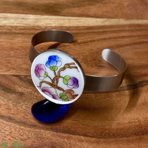 Mentett porcelán darabok - virágos nemesacél karperec - állítható