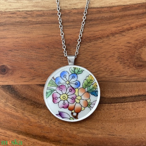 Mentett porcelán darabok - virágos nagy medálos nyaklánc - nemesacél