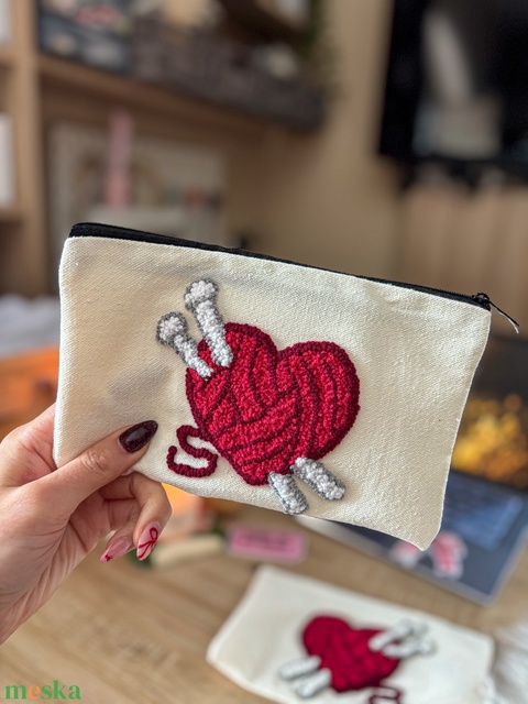 Hímzett tolltartó, horgolt szív minta