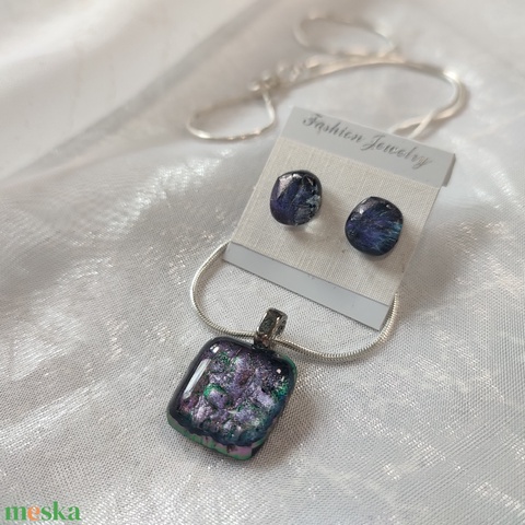 Csillogó fémes lila dichroic antiallergén üvegékszer, pötty füli és medál