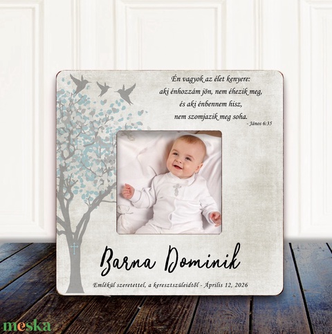 A keret névvel, dátummal és egy kedves idézettel készül, így minden darab egyedi és szívből jövő ajándék. Az idézet igény szerint változtatható.