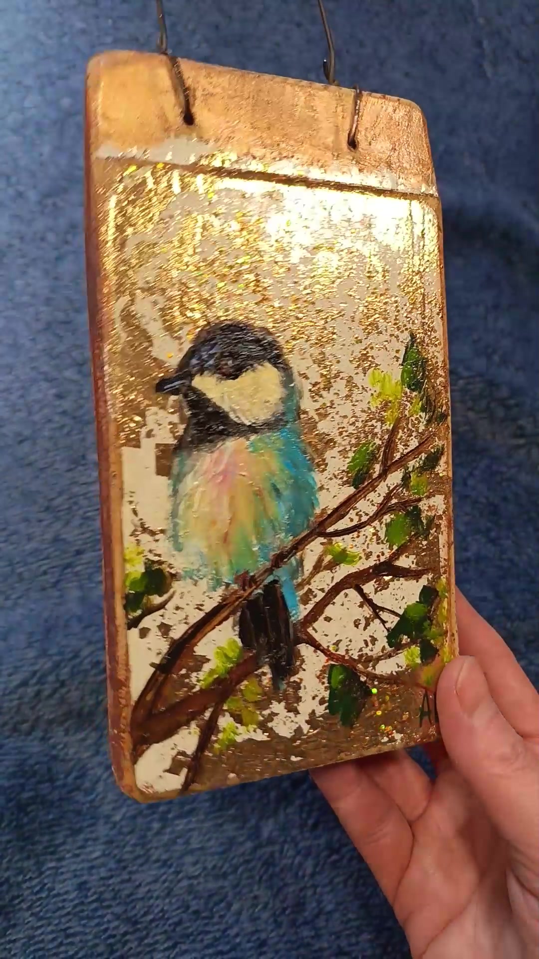 Kék cinke - Rusztikus Fatábla, Ajándék ötlet - Egyedi Falidísz, Gyerekszoba, Madár, Arany, Csillogó