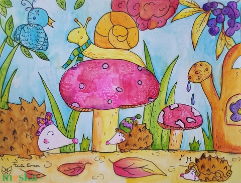 Erdei őszi kép sünikkel, csigaúrral és madárkával!!