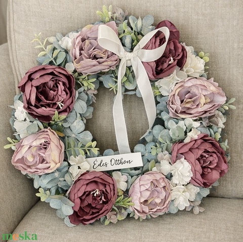 - Anyag/Összetevő műlevél, eukaliptusz, szaténszalag, hortenzia, bazsarózsa