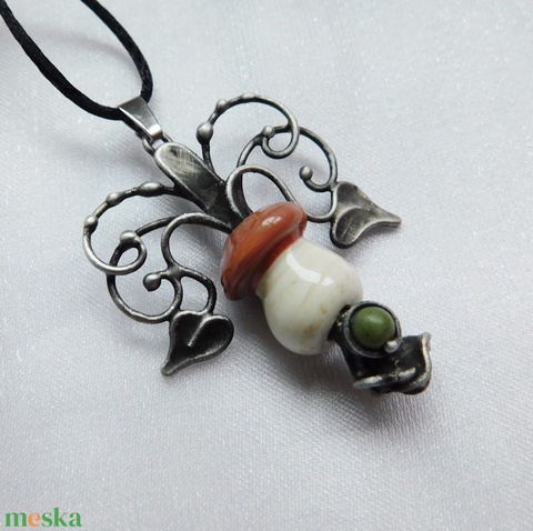 A medál Tiffany technikával készült nefrit jáde, kézzel készült üveg gyöngy egy kolléganőtől, réz és ólommentes, ezüsttartalmú ón felhasználásával. A díszítés szintén saját készítésű, nem tartalmaz gyári elemeket. A fémrészt óezüstre patináztam és lelakkoztam, hogy sokáig szép maradjon.
