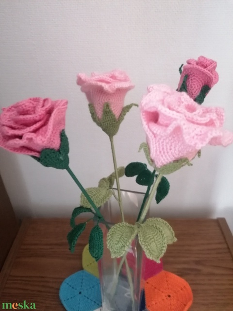 Horgolt rózsaszín rózsa, szárába és levelében dróttal, így tetszés szerint hajlítható. Bármilyen színben készítek. Tökéletes Valentin napi ajándék. A bimbó 1000ft.,a közepes 2000,a nagy 3000ft.