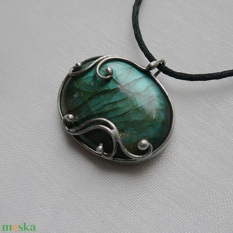 A medál Tiffany technikával készült labradorit és ólommentes, ezüsttartalmú ón felhasználásával. A díszítés szintén saját készítésű, nem tartalmaz gyári elemeket. A fémrészt óezüstre patináztam, lekezeltem antioxidánsal és lelakkoztam, hogy sokáig szép maradjon.