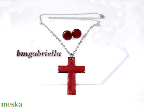 Tűzzománc ékszerszett - kereszt medál orvosi fém láncon és pontfülbevaló - bordó