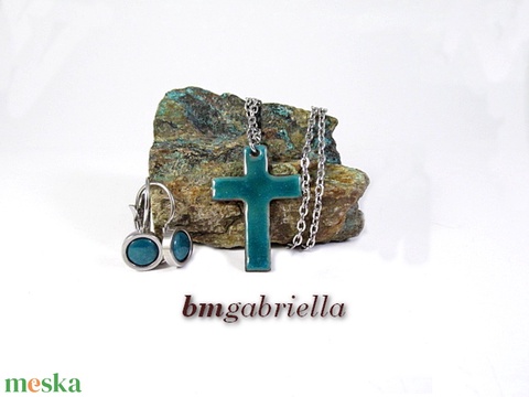 Tűzzománc ékszerszett - kereszt medál orvosi fém láncon és francia kapcsos fülbevaló - türkiz