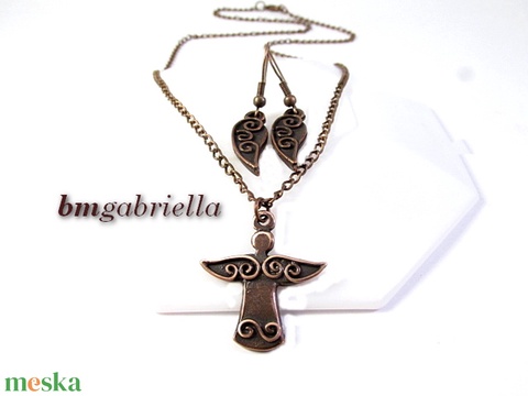 Kisangyal - kézműves ékszerszett - angyal medál vörösréz láncon, angyalszárny fülbevaló