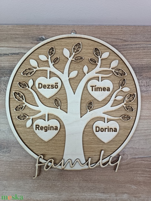 Személyre szabható fa családfa – gravírozott nevekkel, falra akasztható ajándék