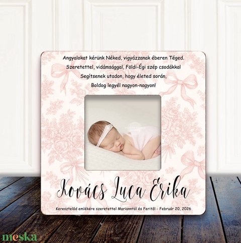 A keret névvel, dátummal és egy kedves idézettel készül, így minden darab egyedi és szívből jövő ajándék. Szépen mutat gyerekszobában, nappaliban vagy akár egy emléksarok részeként is. Az idézet igény szerint változtatható.