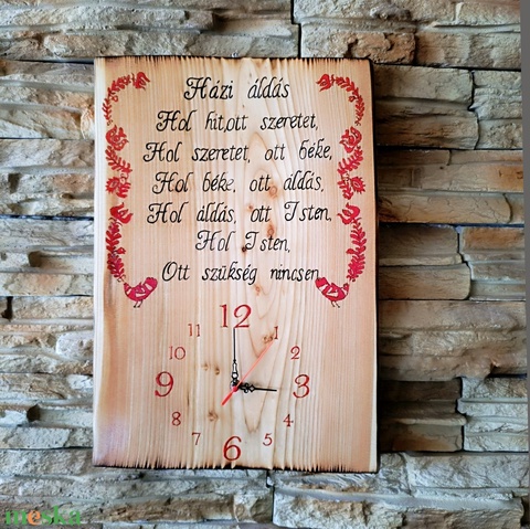 Nagyméretű fából készült falióra Házi áldással és magyar motívummal