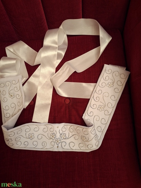 Himzett öv, fehér alapon arany, ezüst szinű himzéssel.