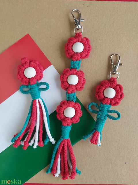 Nemzeti színű makramé szett (kitűző, kulcstartó és táskadísz)