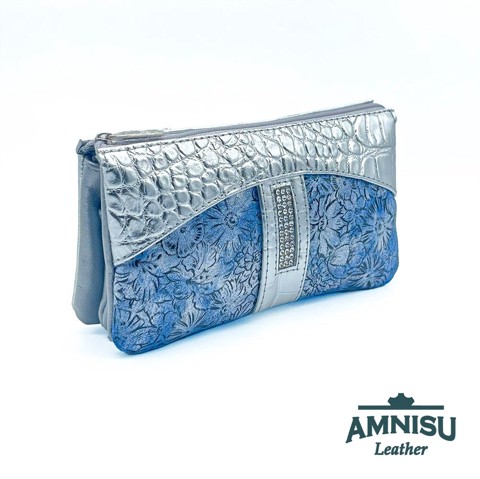 Ezüst krokkómintás - kék virág mintás egyenes kristály köves női pénztárca G1002