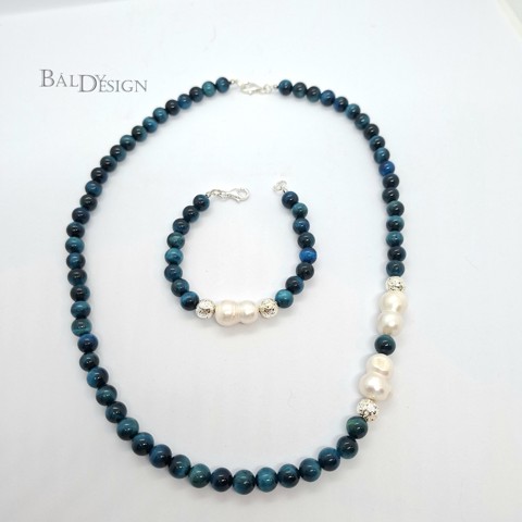 Kék tigrisszem és valódi gyöngy ékszerszett – Elegancia és VédelemVigyél egy csipetnyi misztikumot a mindennapjaidba ezzel az egyedi, kézzel készült kék tigrisszem ékszerszettel. A szett egy hangsúlyos nyakláncból és egy hozzá illő karkötőből áll, melyekben a természetes ásványok ereje és a barokk gyöngyök lágy fénye alkot tökéletes harmóniát Ez a kék tigrisszem szett igazán különleges választás: a mély, misztikus sötétkék árnyalatok és a természetes gyöngyök eleganciája találkozik benne. Miért válaszd ezt a szettet?Prémium Alapanyagok: A mélykék, selymes fényű kék tigrisszem (más néven sólyomszem) golyók mellett valódi, különleges formájú édesvízi tenyésztett gyöngyöket használtunk.Kifinomult Design: Az aszimmetrikus elrendezés és az ezüstös díszítőelemek modern, mégis időtálló megjelenést kölcsönöznek viselőjének.Spirituális Jelentés: A kék tigrisszemet a nyugalom és a tiszta látás kövének tartják, amely segít csökkenteni a stresszt és növeli az önbizalmat.Ez a sötétkék szett remekül mutat egy klasszikus fehér inggel, de egy elegáns esti ruhát is koronázhatunk vele. A kék tigrisszem különleges csillogása (chatoyance effektus) mozgás közben érvényesül igazán, ahogy megcsillan rajta a fény.Ajándéknak is tökéletes!Legyen szó születésnapról, évfordulóról vagy névnapról, ez az ásvány ékszerszett garantáltan örömet okoz azoknak, akik kedvelik a természetes köveket és az egyedi kézműves darabok. Stílus tipp:Ez a sötétkék szett remekül mutat egy klasszikus fehér inggel, de egy elegáns esti ruhát is koronázhatunk vele. A kék tigrisszem különleges csillogása (chatoyance effektus) mozgás közben érvényesül igazán, ahogy megcsillan rajta a fény.A nyaklánc hossza: 58cm, a karkötő hossza: 20,5cm