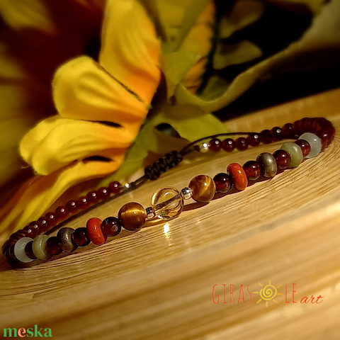 gránát, citrin, tigrisszem, vörös jáspis, pirit, zöld jáde, zöld aventurin, sterlingezüst, poliészter zsinór