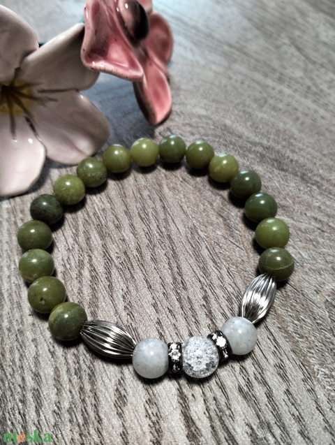 Női Ásványkarkötő - Roppantott hegyikristály + Fehér holdkő + Jáde