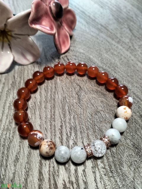 Női Ásványkarkötő - Roppantott hegyikristály + Fehér holdkő + Tűzachát + Karneol