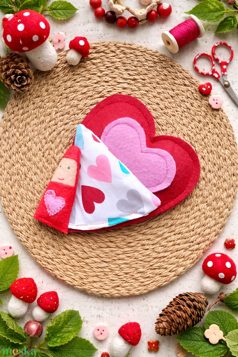 Valentin manó szív kuckóban - Filc játék gyerekeknek - szerelmes manó szívecske ágyban