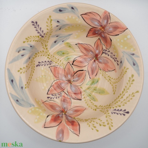 Kézzel készült kerámia mélytányér – piros virágmintával