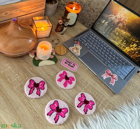 Hímzett autós poháralátét, szív masni minta
