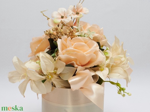 Elegáns barack rózsás virágbox krém liliomokkal – romantikus virágdoboz ajándék
