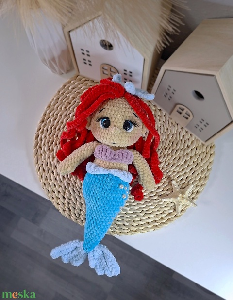 Horgolt hableány baba - piros hajjal