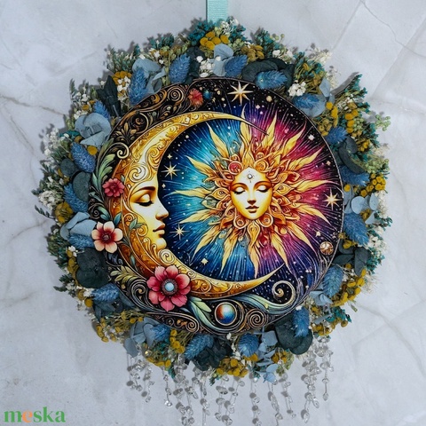 Ez a különleges ajtódísz a Nap és a Hold ősi szimbólumára épül, a párkapcsolati harmónia, az egymásra hangolódás és az energetikai egyensúly jegyében. Két minőség, két lélek, egy közös tér – teljes egészében szárazvirágokból készült, időtálló, spirituális formában.