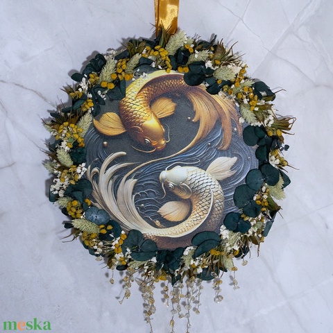 - Anyaga: szalma alap, szalag, szárazvirág, fatábla, citrin féldrágakő