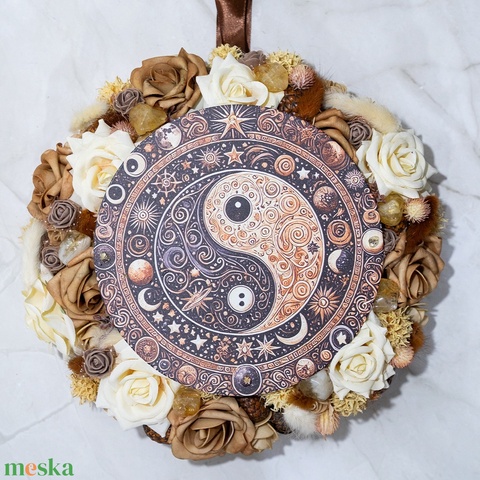 - Anyaga: selyemvirág, szalag, termések, szalmaalap, citrin