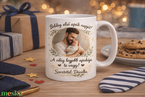 Lepd meg az újdonsült apukát egy igazán szívhez szóló, személyre szabott ajándékkal! Ez a különleges apák napi bögre az első közös ünnepet teszi felejthetetlenné.