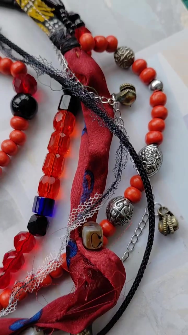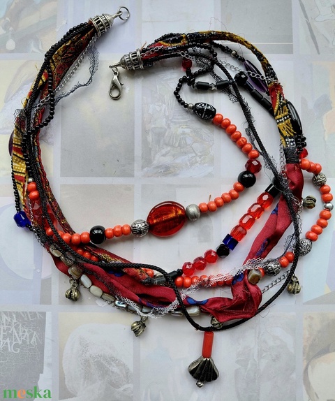 üveggyöngyök, fagyöngyök, zsinórok, csipke, ezüst szinű lánc, fém dekorelemek, végzárók, delfinkapocs