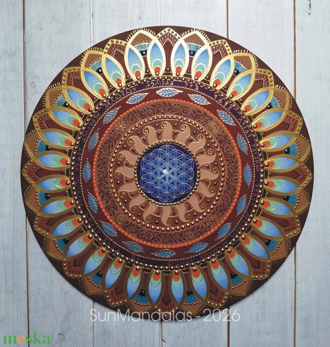 Egyedi ötlet alapján, akrilfestékkel festett és lakkozott Mandala nyírfa alapra. Kender zsinór akasztóval, függőkkel és fa gyöngyökkel és fácán tollakkal. Földeléshez és belső stabilitásunk kialakításához is használható.