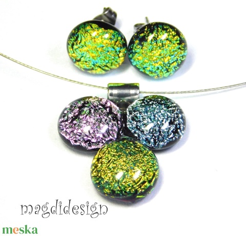 Arany-ezüst-rózsaszín dichroic bogyós színtrió üvegékszer szett nyaklánc stiftes fülbevaló
