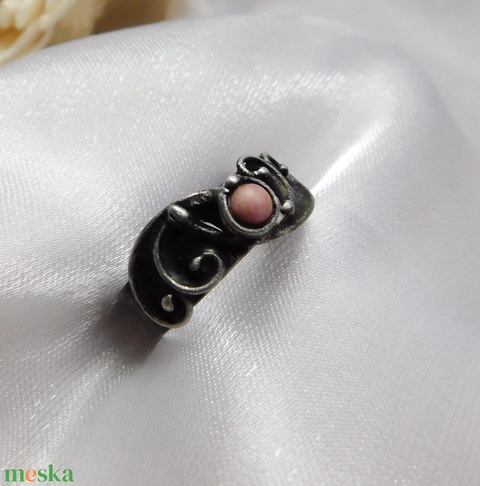 A gyűrű Tiffany technikával készült rodonit, réz és ólommentes, ezüsttartalmú ón felhasználásával. A díszítés szintén saját készítésű, nem tartalmaz gyári elemeket. A fémrészt óezüstre patináztam és lelakkoztam, hogy sokáig szép maradjon.