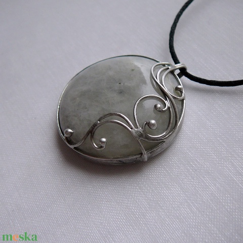 A medál Tiffany technikával készült szivárvány holdkő és ólommentes, ezüsttartalmú ón felhasználásával. A díszítés szintén saját készítésű, nem tartalmaz gyári elemeket. A fémrészt óezüstre patináztam és lelakkoztam, hogy sokáig szép maradjon.