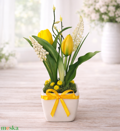 Élethű tulipánok kerámia kaspóban-sárga masnis