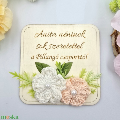 Gravírozott fa hűtőmágnes egyedi felirattal, horgolt virágokkal - Ajándék tanító néninek, óvó néninek