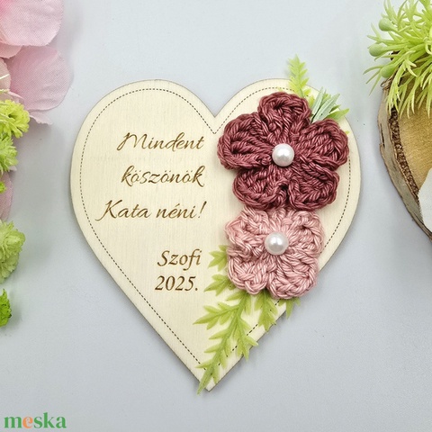 Gravírozott szív alakú fa hűtőmágnes egyedi felirattal, horgolt virágokkal - Ajándék tanító néninek, óvó néninek