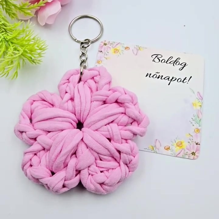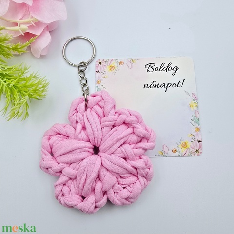 Rózsaszín horgolt virág kulcstartó ajándékkártyával - Nőnapi ajándék, Boldog nőnapot! feliratos kártyával
