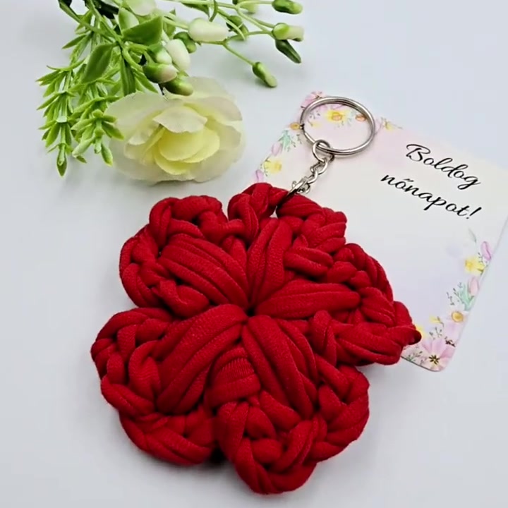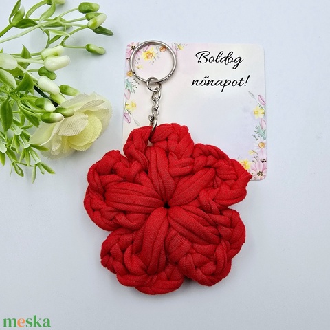 Piros horgolt virág kulcstartó ajándékkártyával - Nőnapi ajándék, Boldog nőnapot! feliratos kártyával